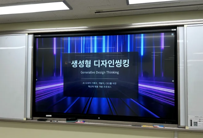 그래서 이제 우리는 학생들에게 단지 AI 사용법만 가르쳐서는 안 됩니다. AI와 함께 사고하는 법, AI와 함께 만드는 법, AI가 만든 결과를 비판적으로 검토하는 법, 그리고 무엇보다 그것을 인간의 가치와 책임의 기준으로 판단하는 법을 가르쳐야 합니다. 저는 그 교육적 방향을 설명하는 하나의 이름으로 ‘생성형 디자인씽킹’을 제안드립니다.